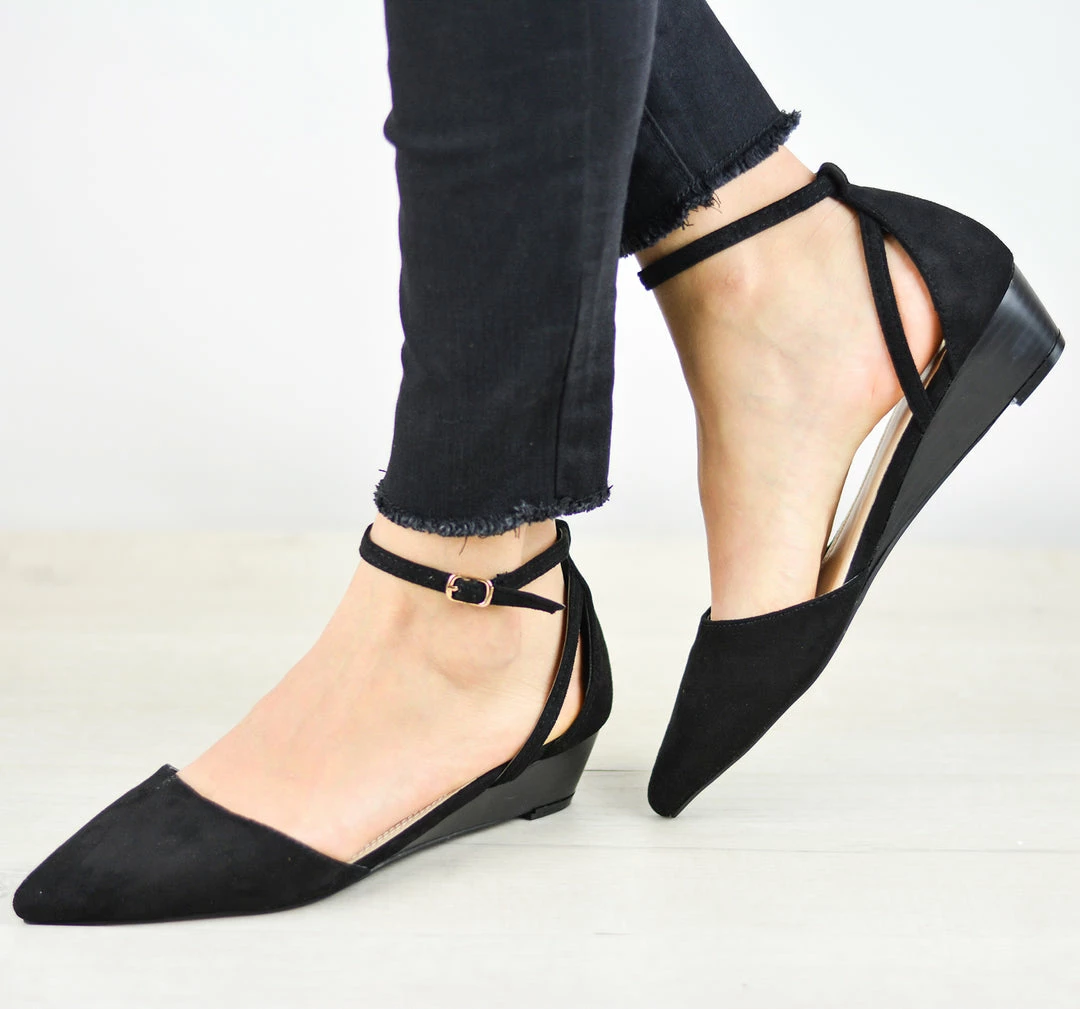 A pointed-toe d’Orsay silhouette rendered with buttery-soft microsuede. A slim ankle strap, side cutouts, and tiny wedge heel complete this fierce style choice.