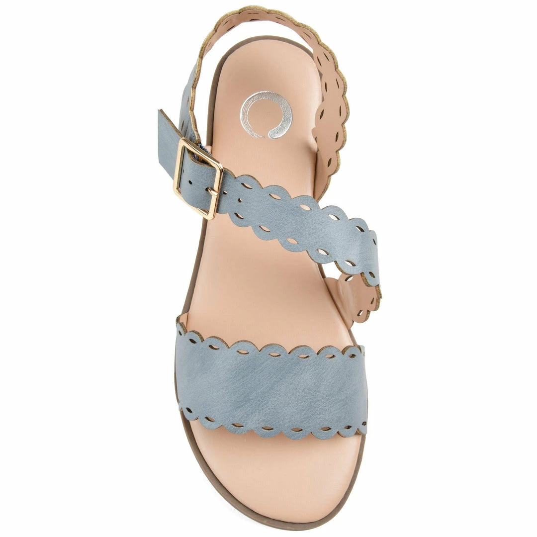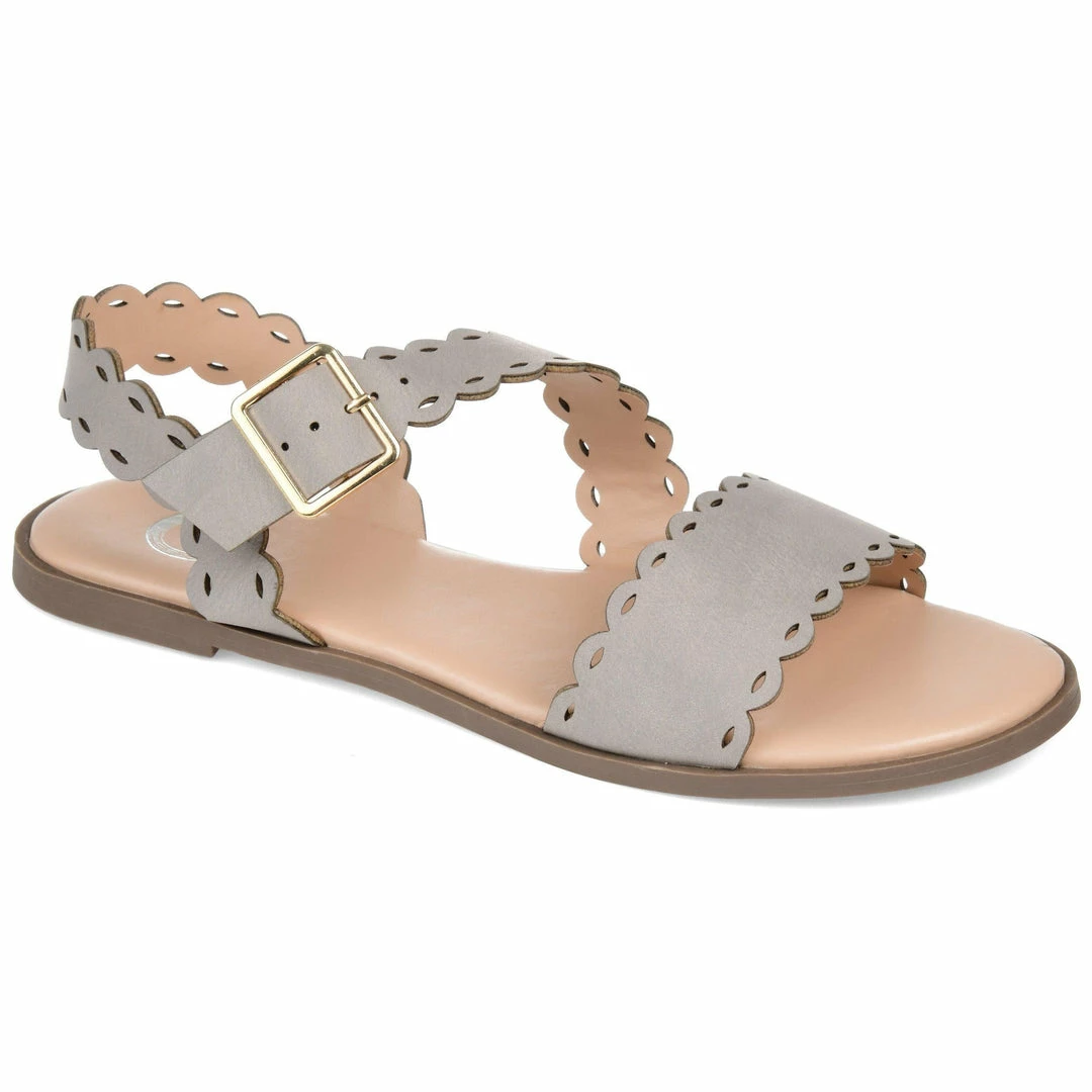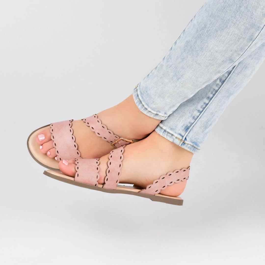 A toe strap sandal detailed with darling scalloped trim and a crossover accent fastened by a gold-tone buckle.