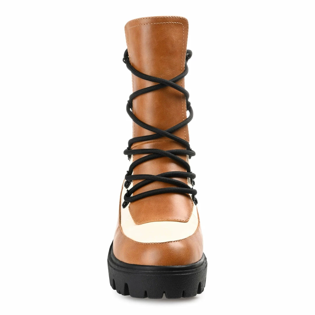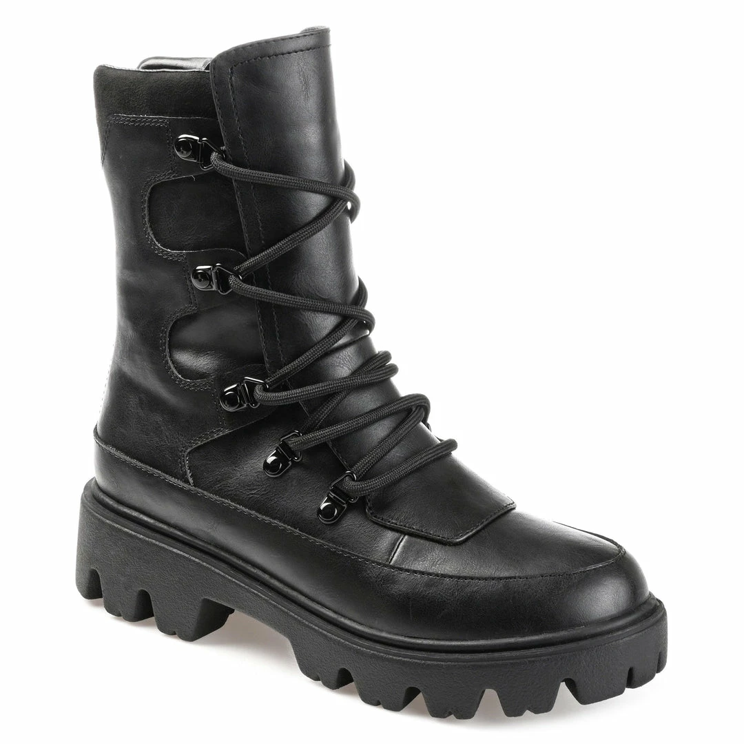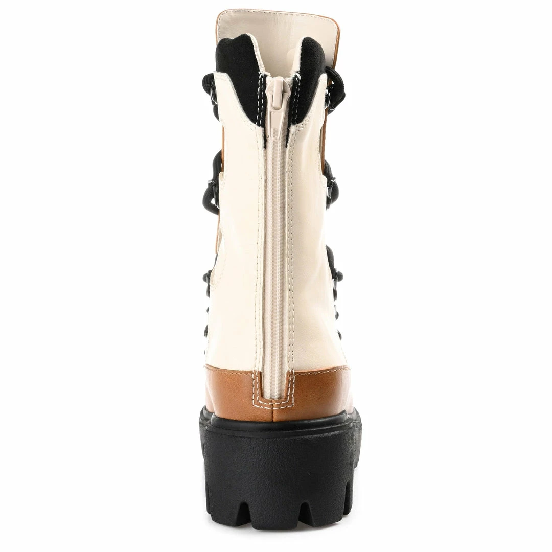 A fabulous take on the vegan leather hiker bootie complete with black eyelets and a retro lug sole.
