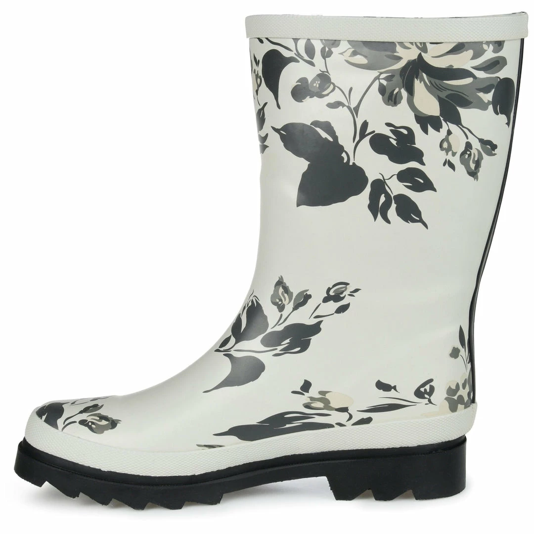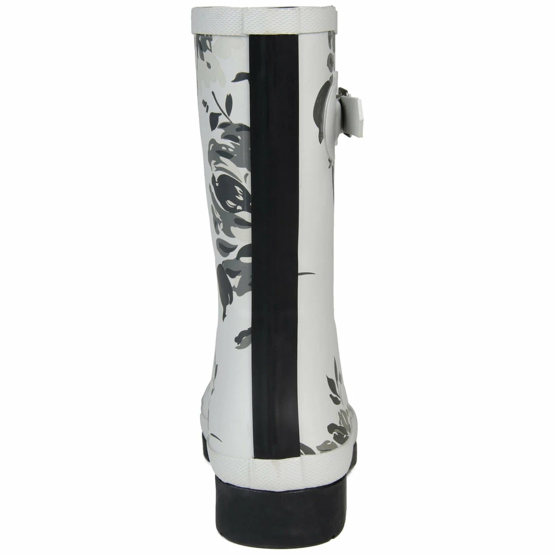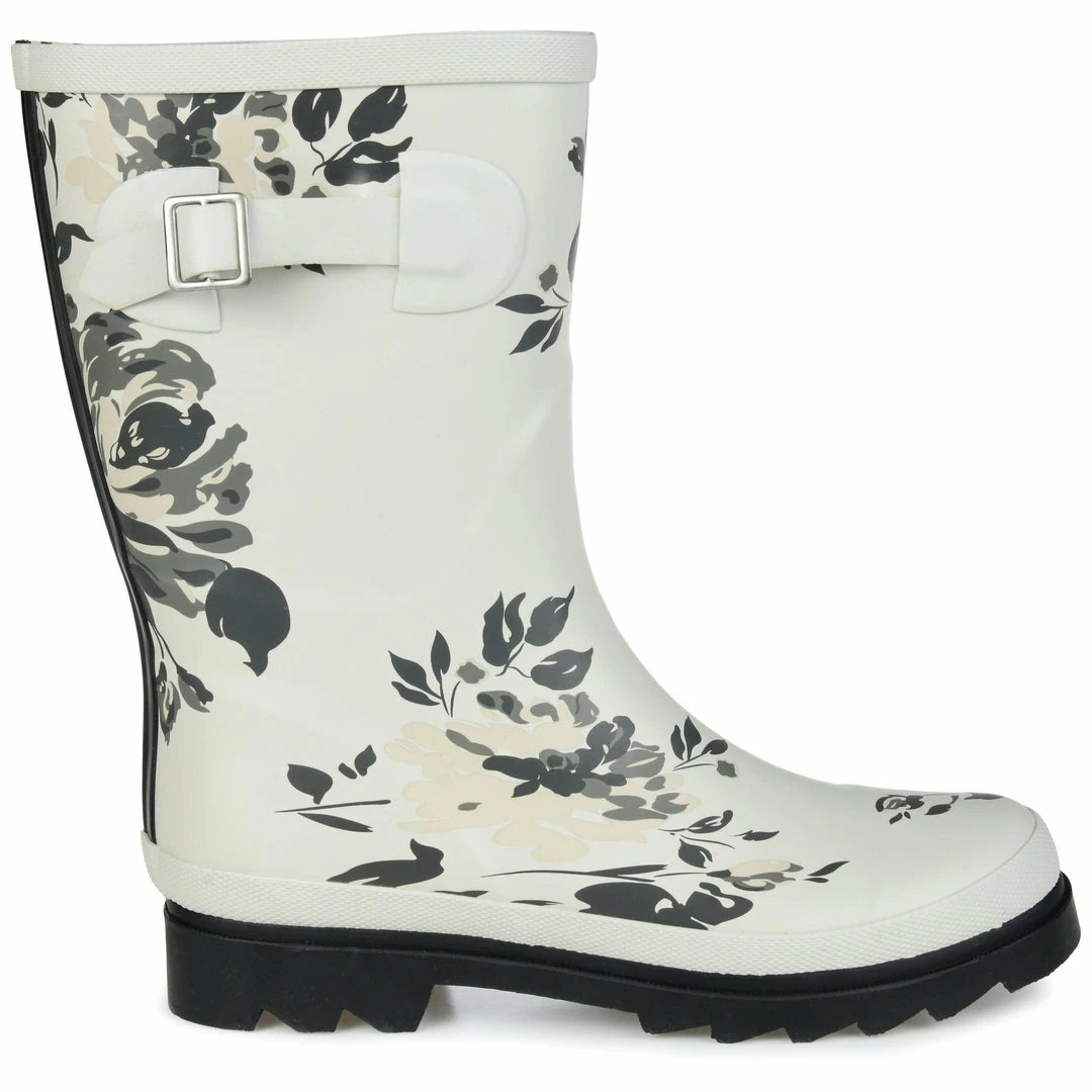 Tread through the rain and slush with ease in these waterproof rubber rain boots—a buckle accent, low block heel, and textured sole complete this round-toe mid-height design.