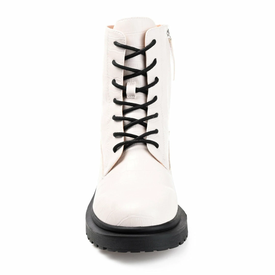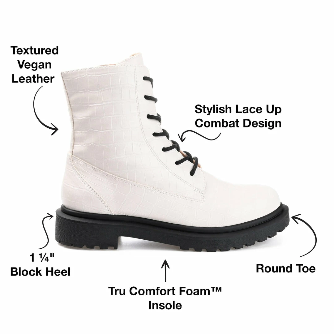 A retro combat bootie with croc textured vegan leather, and a low block heel for a femme take.