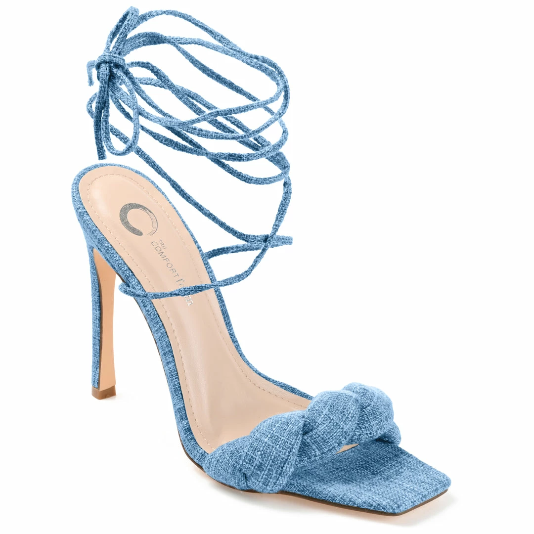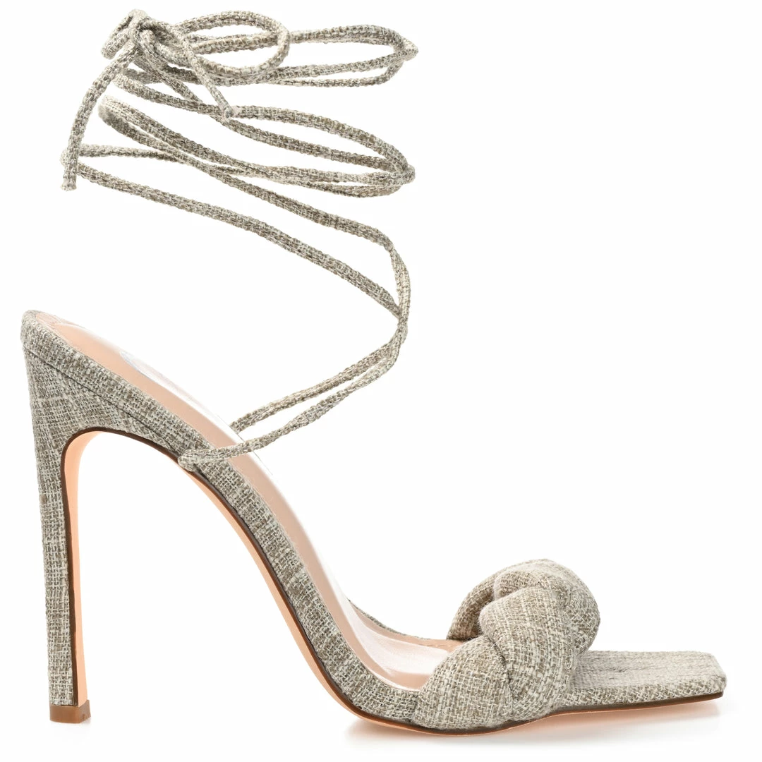 Wrap up your favorite going-out looks with this strappy stiletto topped with linen fabric.