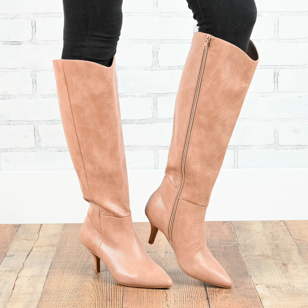 A super sleek boot that is sure to turn heads with its lizard textured details and pointed-toe.