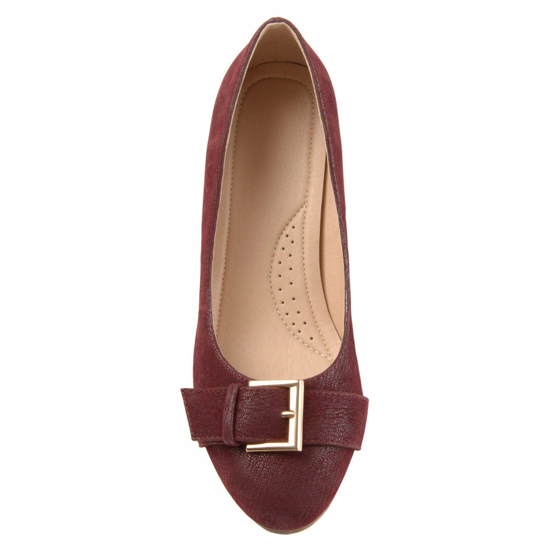 A charming design created for all-day wear with a comfort insole, this round-toe silhouette features soft faux suede uppers topped with a buckled strap accent and a low stacked wedge heel.