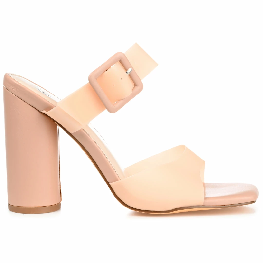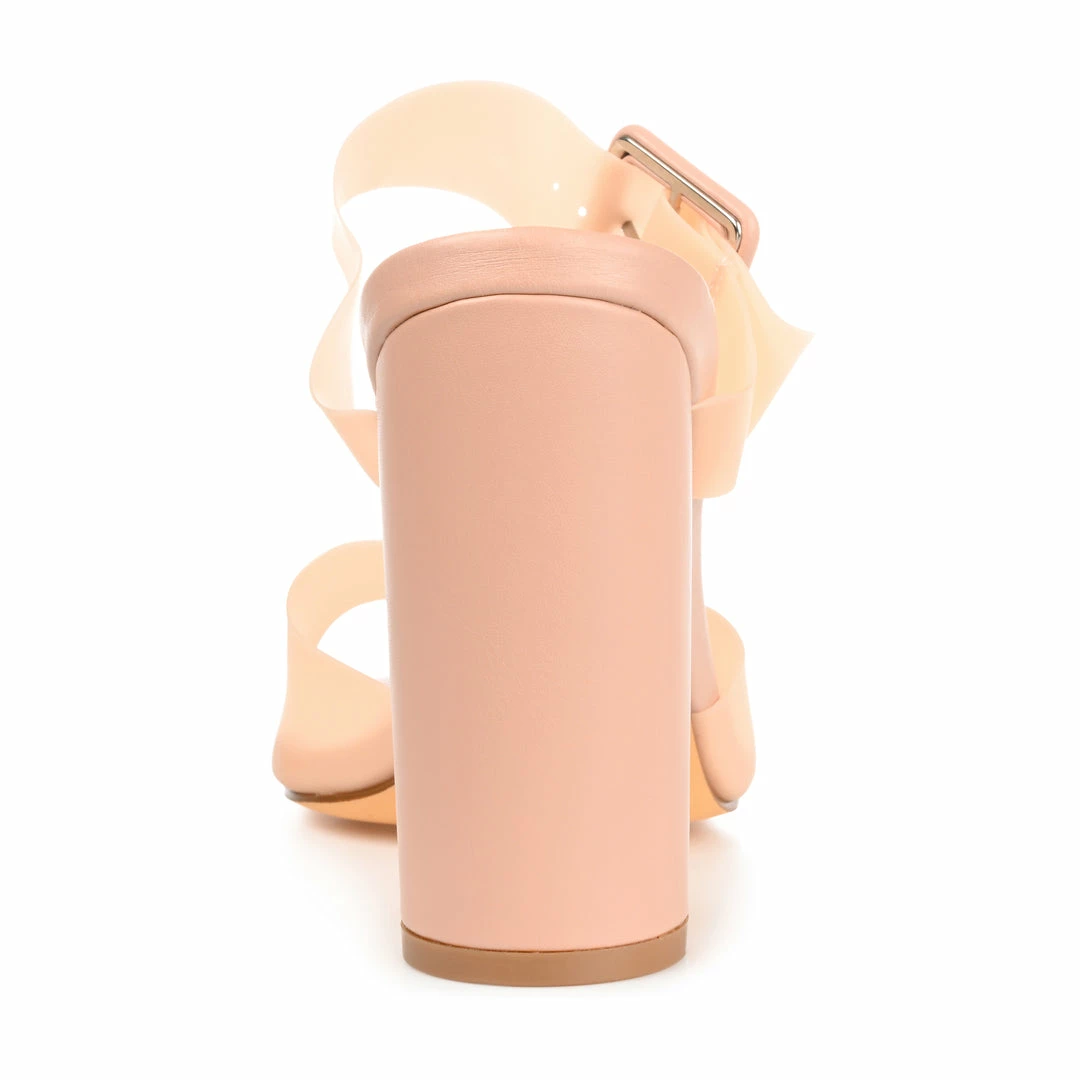 A classic 90s style reimagined with vinyl straps and a rounded heel.