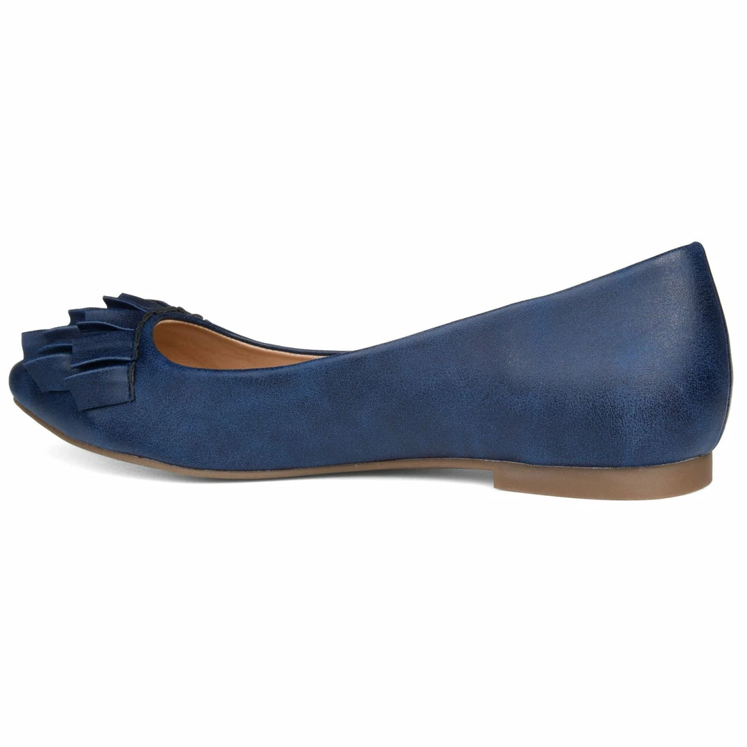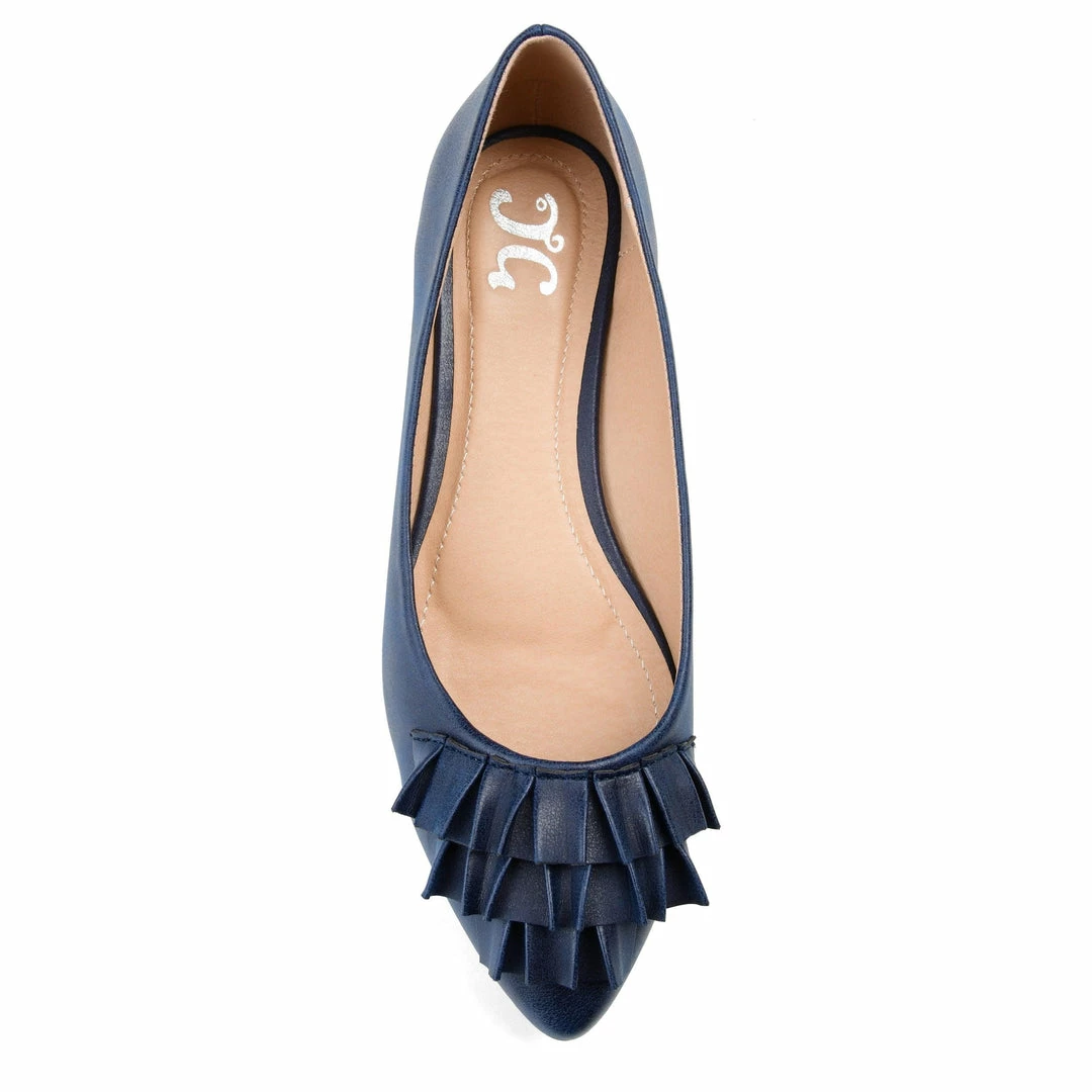 Ruffled accents top this pointed-toe flat for a preppy look, supple vegan leather uppers lined with a padded footbed finish this essential design.