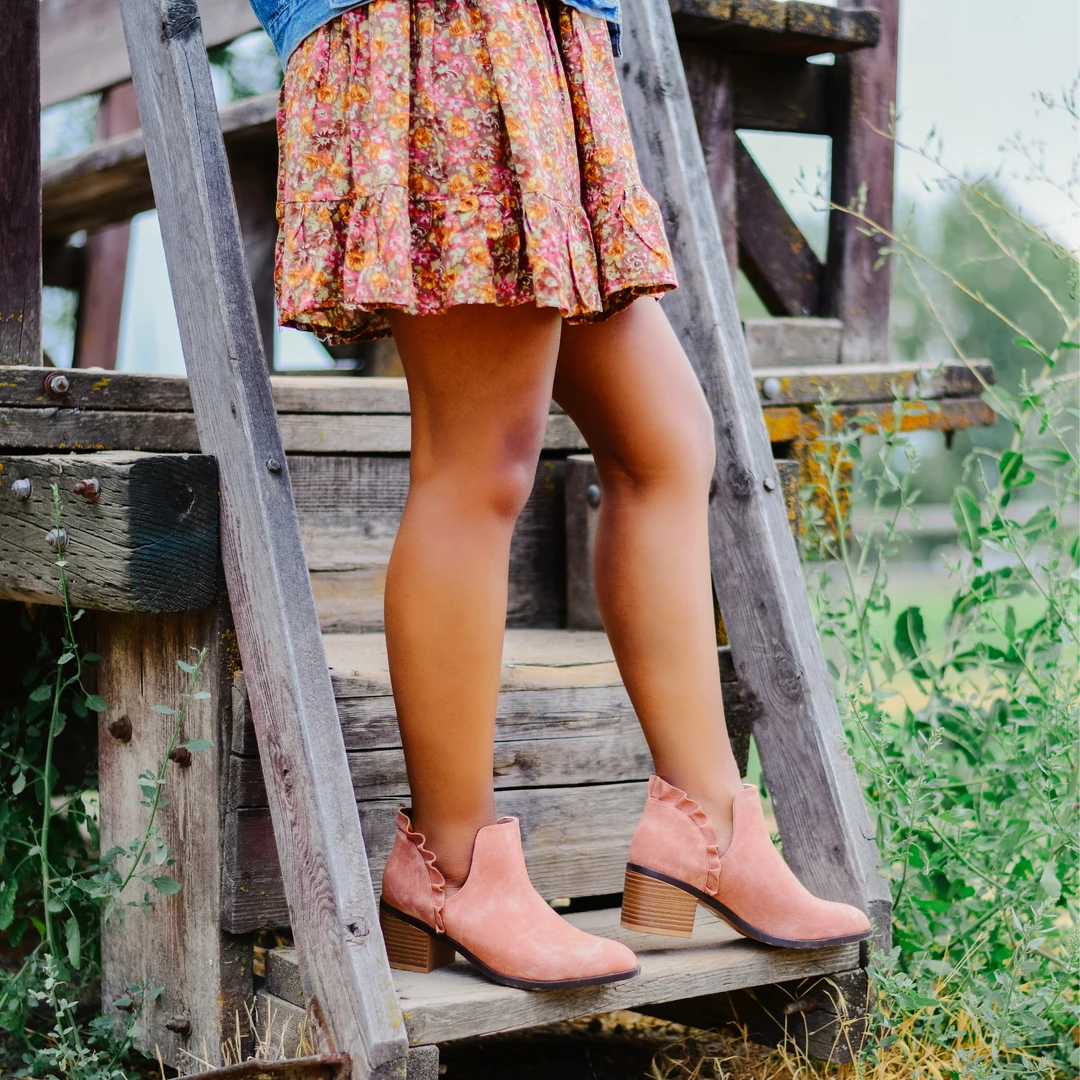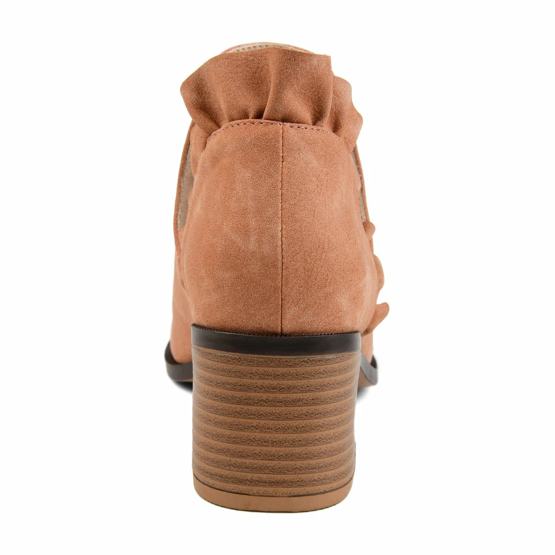 A ruffled accent frames the heel of this side-cutout vegan leather block heeled bootie.