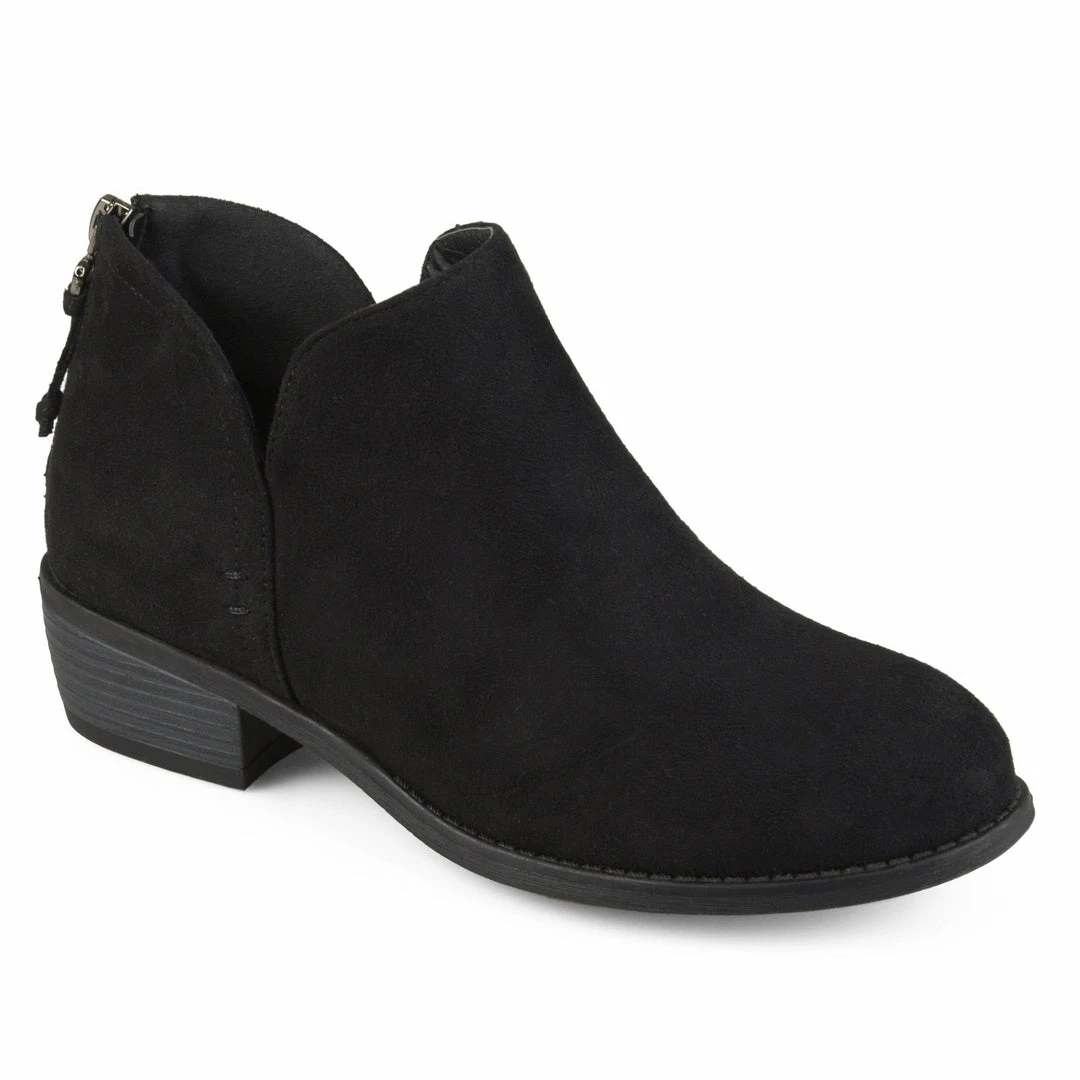 A notched topline and an exposed tasseled zipper enhance this contemporary vegan suede block heeled bootie.