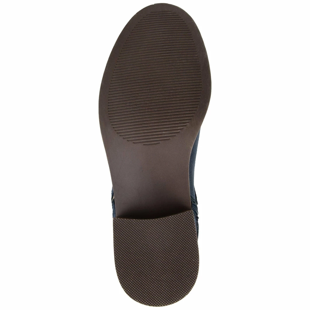 An extra-wide calf round-toe riding boot made with soft vegan suede, framed by western woven details. A low block heel subtly elevates this look, and a smooth zipper finishes the design for easy entry.