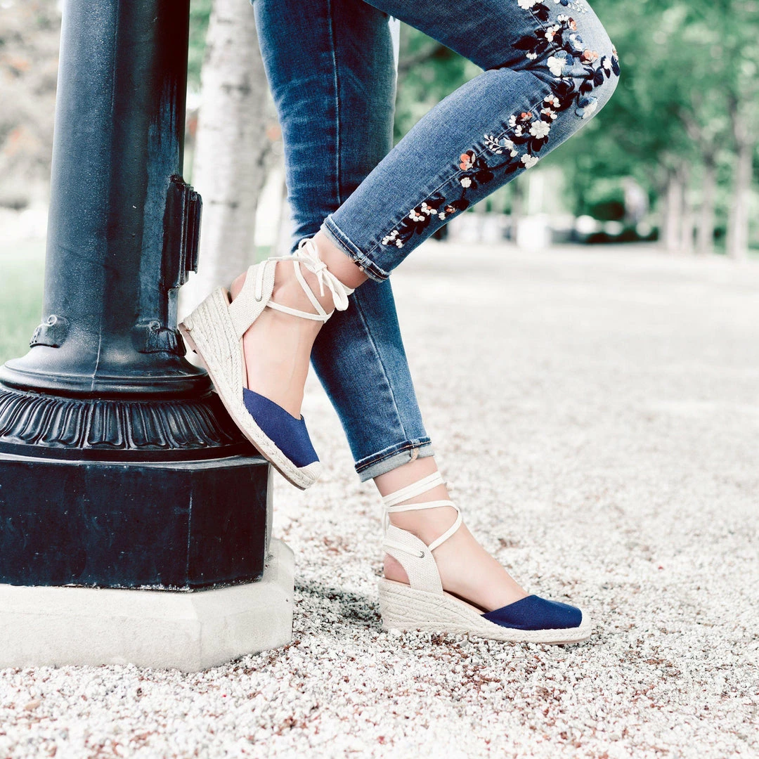 A wedge heel covered in braided espadrille elevates this round-toe silhouette thoughtfully shaped with light canvas fabric. This charming warm-weather look features an open back fastened with interchangeable wrap-around ankle ties that can be styled to your liking and a 4 mm Tru Comfort Foam™ footbed for all-day wear.
