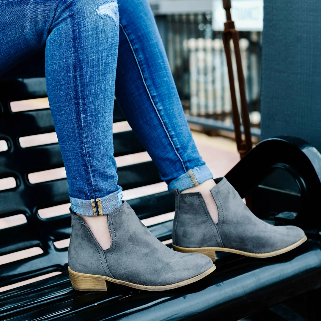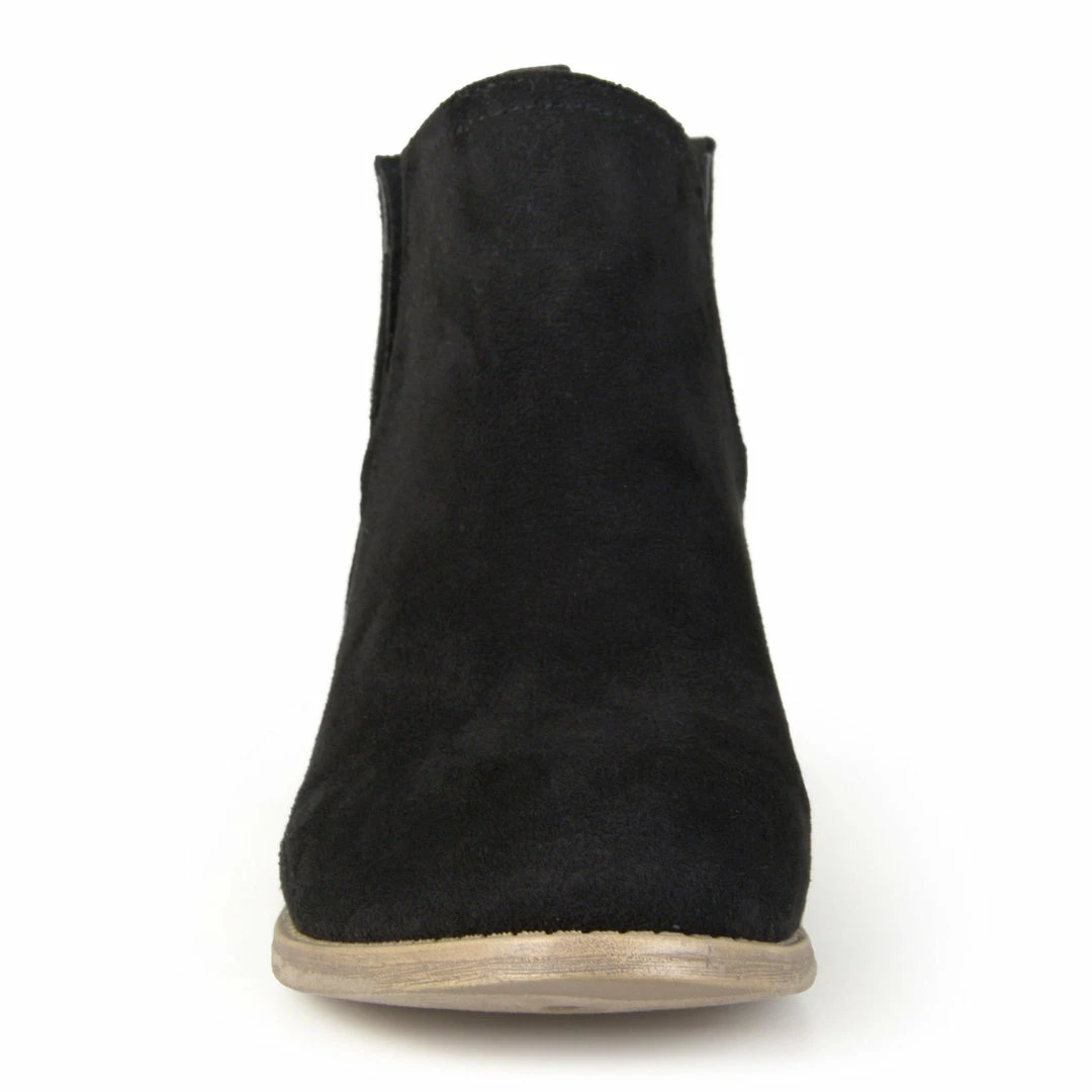 A distinctive split ankle and tab at the heel top this round-toe vegan suede bootie.