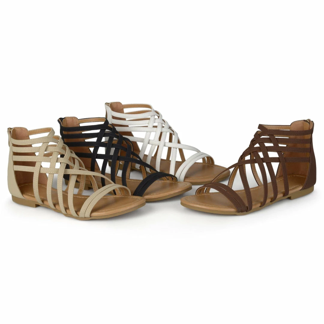 A caged gladiator sandal shaped with slender vegan leather straps fastened by a smooth zipper entry for easy on-off.