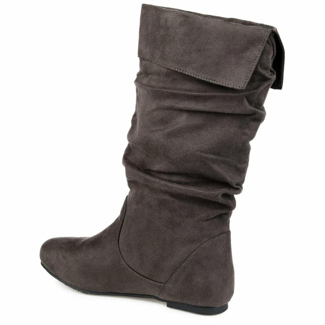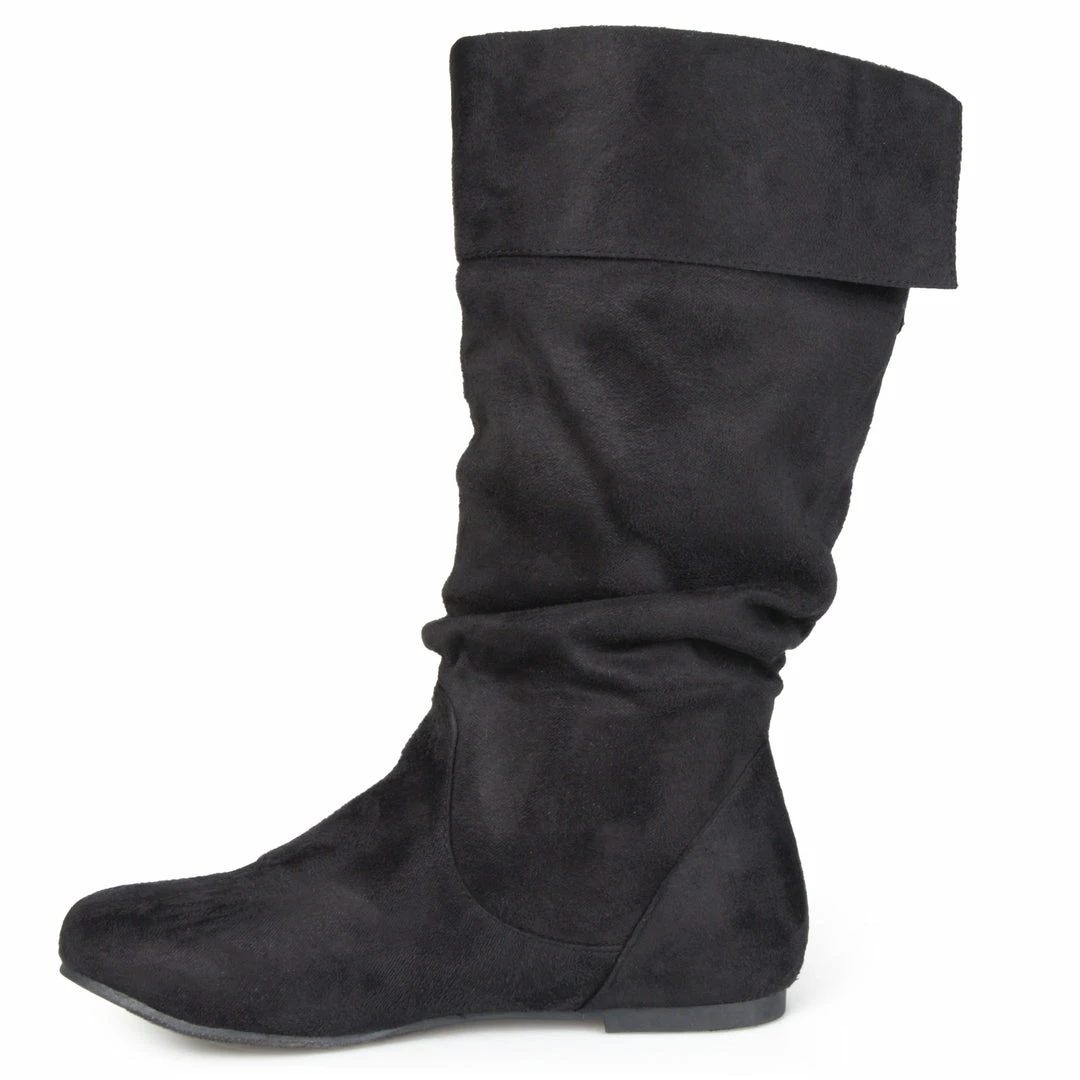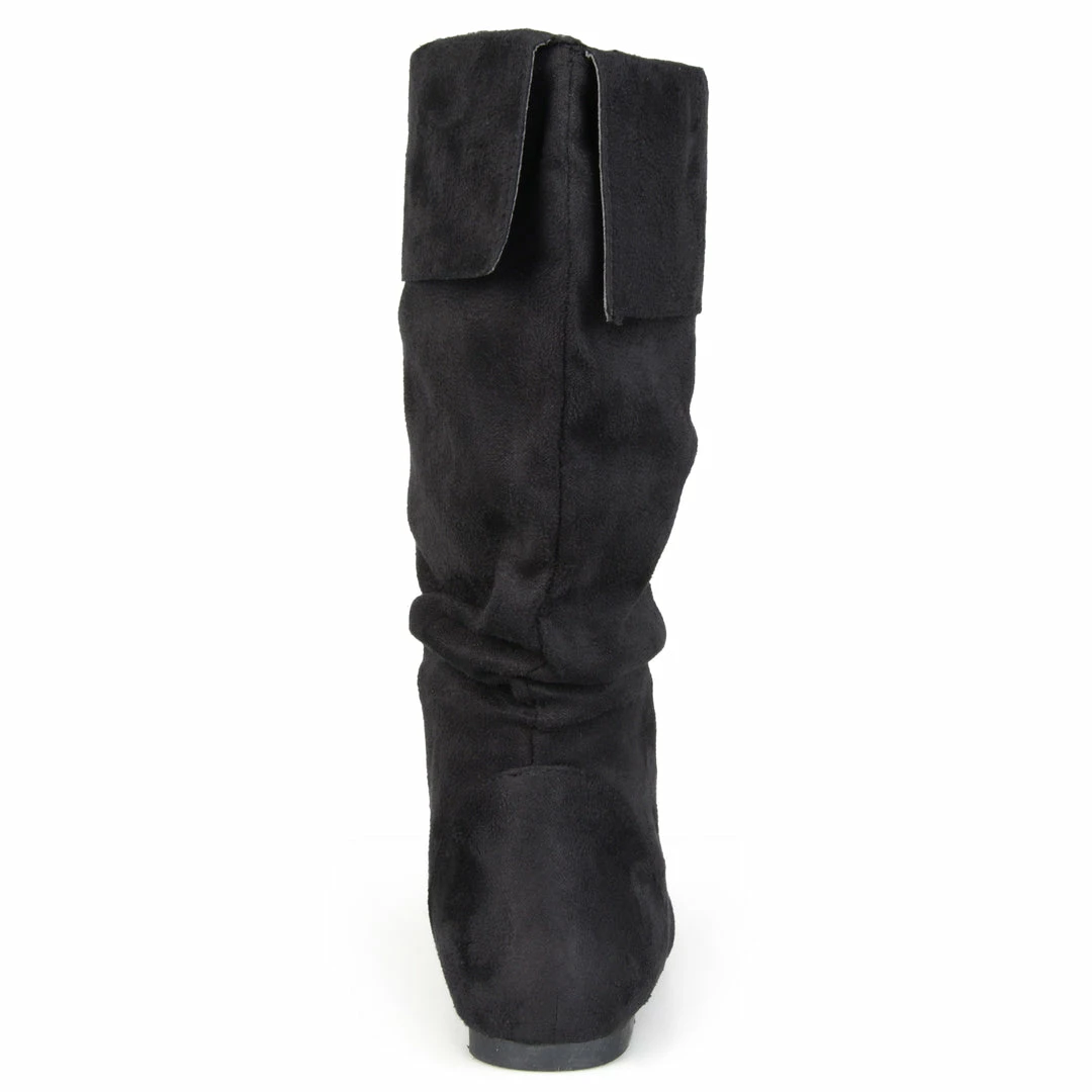 A folded detail tops this round-toe mid-calf boot rendered with slouchy soft vegan suede for an effortless look.