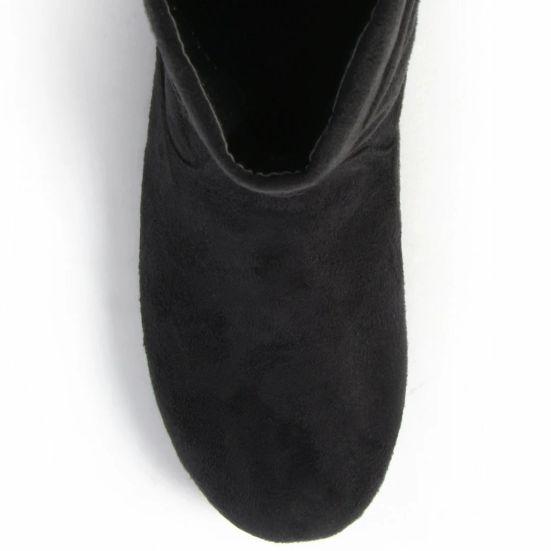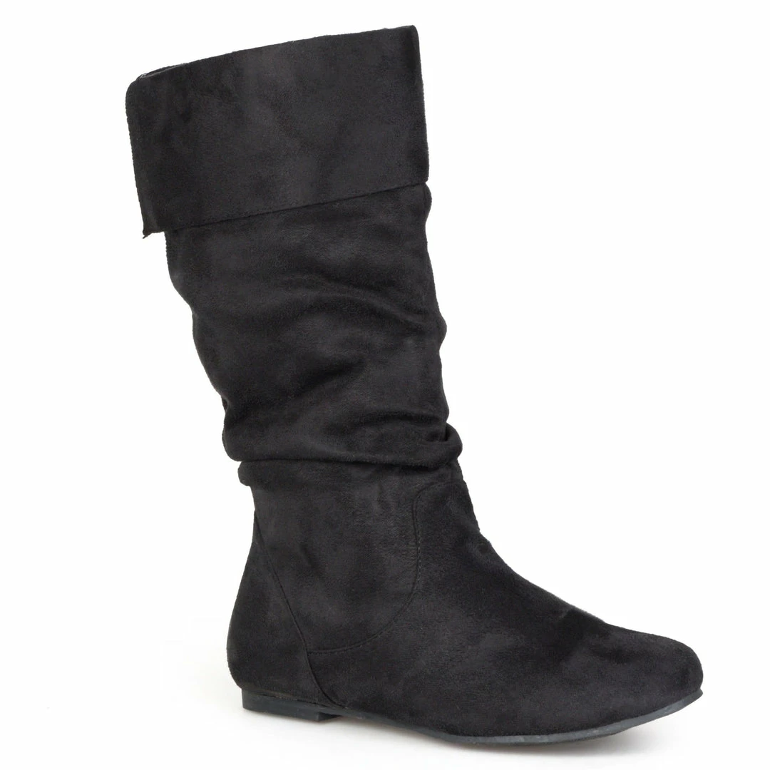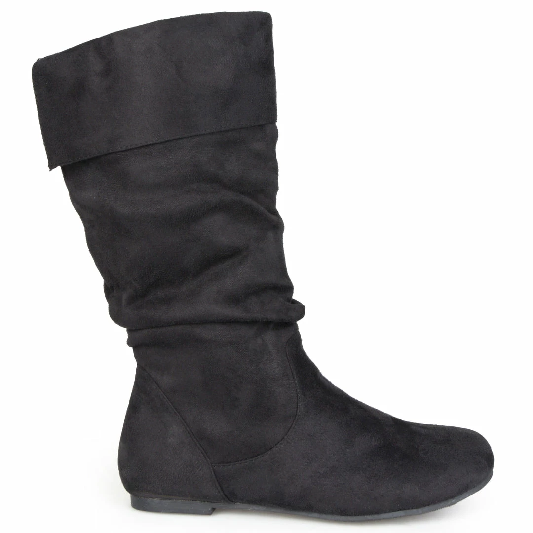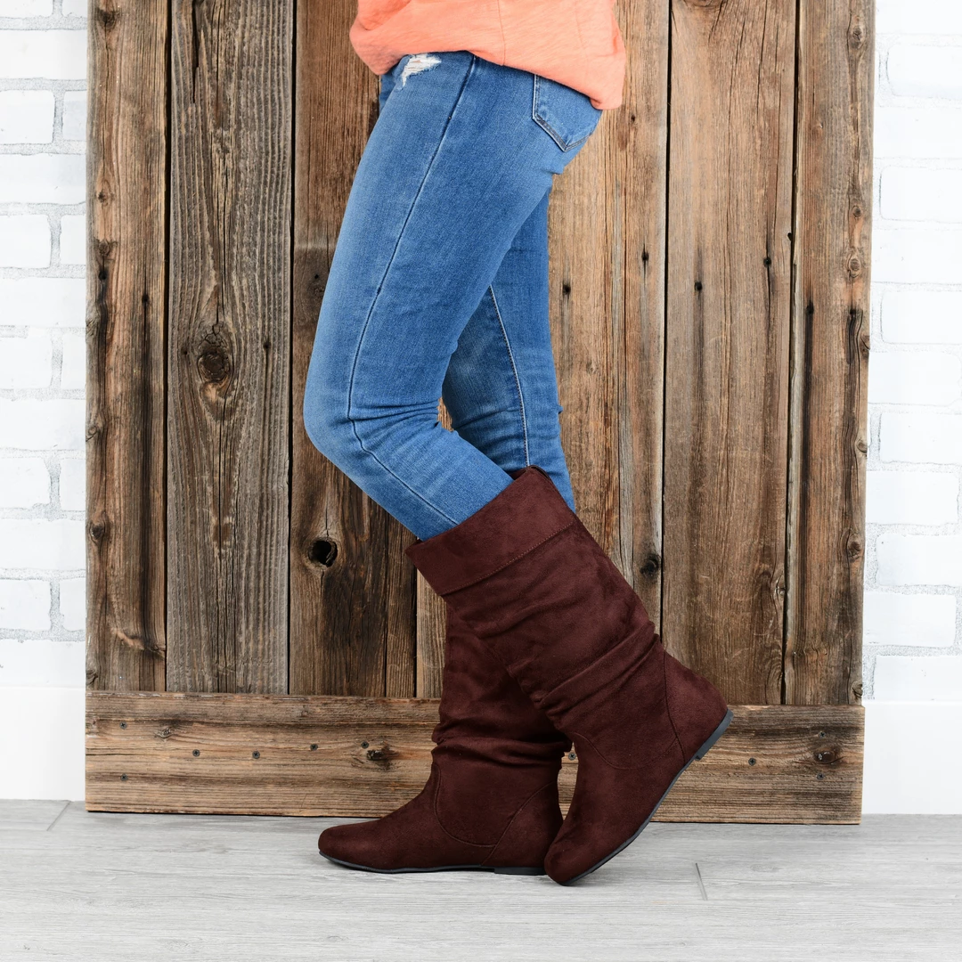 A folded detail tops this round-toe mid-calf boot rendered with slouchy soft vegan suede for an effortless look.