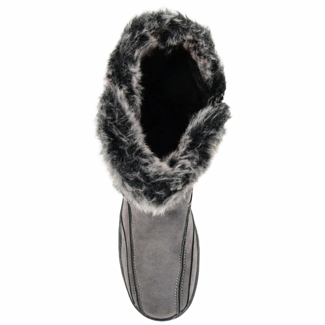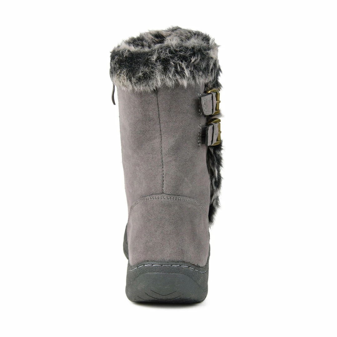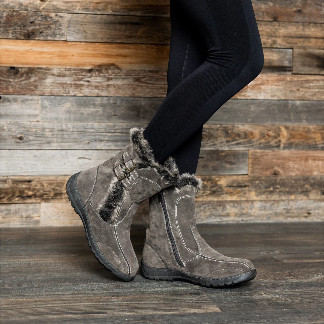 A cool, casual vegan suede pull-on boot featuring cozy synthetic fur trim, dual buckle details at the side, exposed stitching, and a light EVA sole.