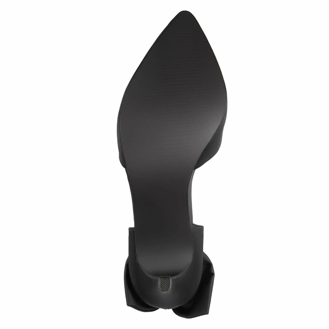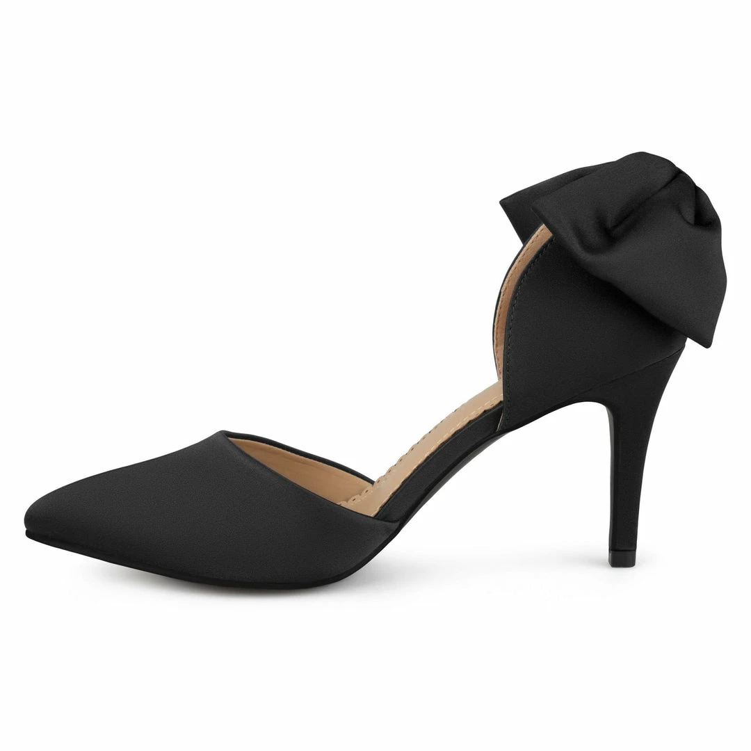 Satin eveningwear pumps featuring sleek stiletto heels and a delightful oversized bow accent at the cuff for an elegant look.