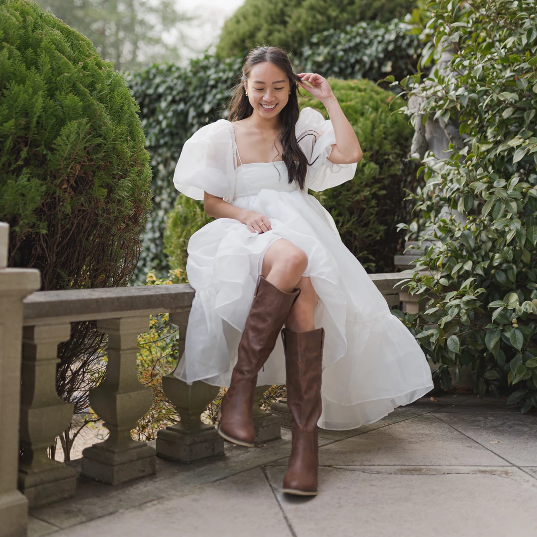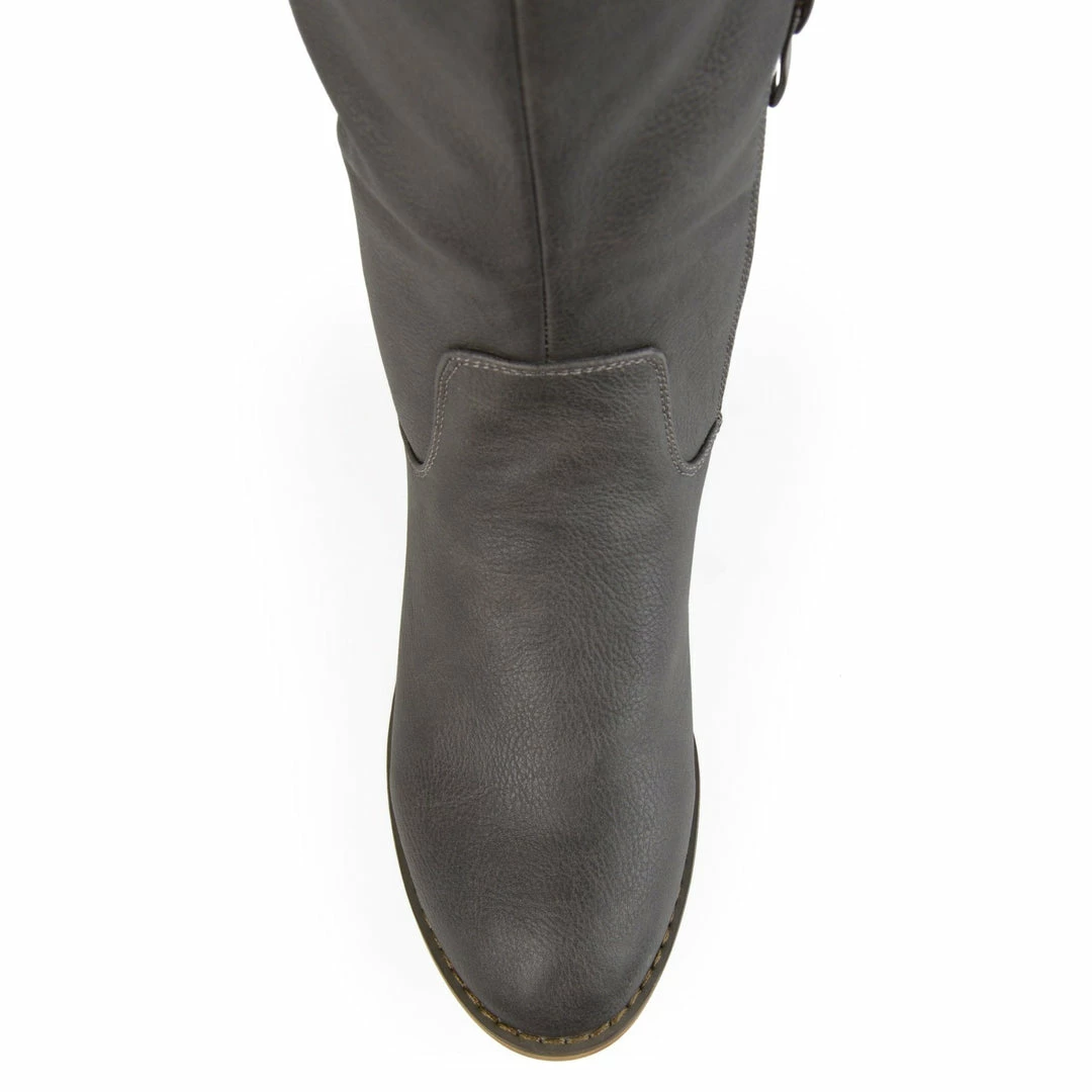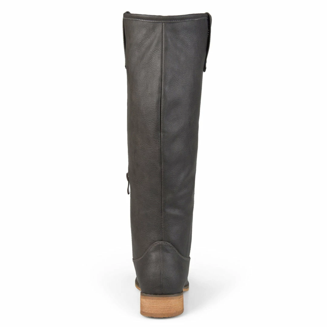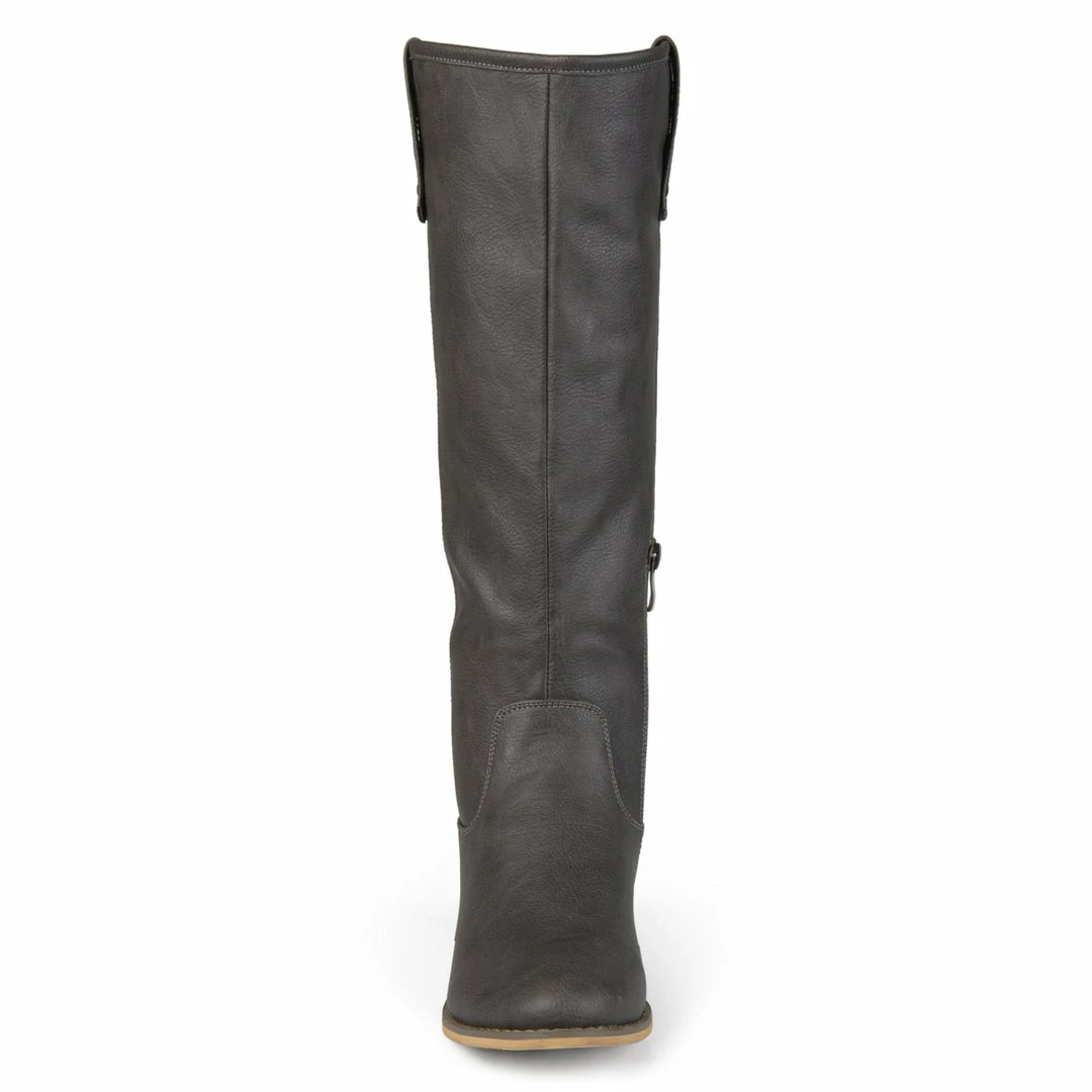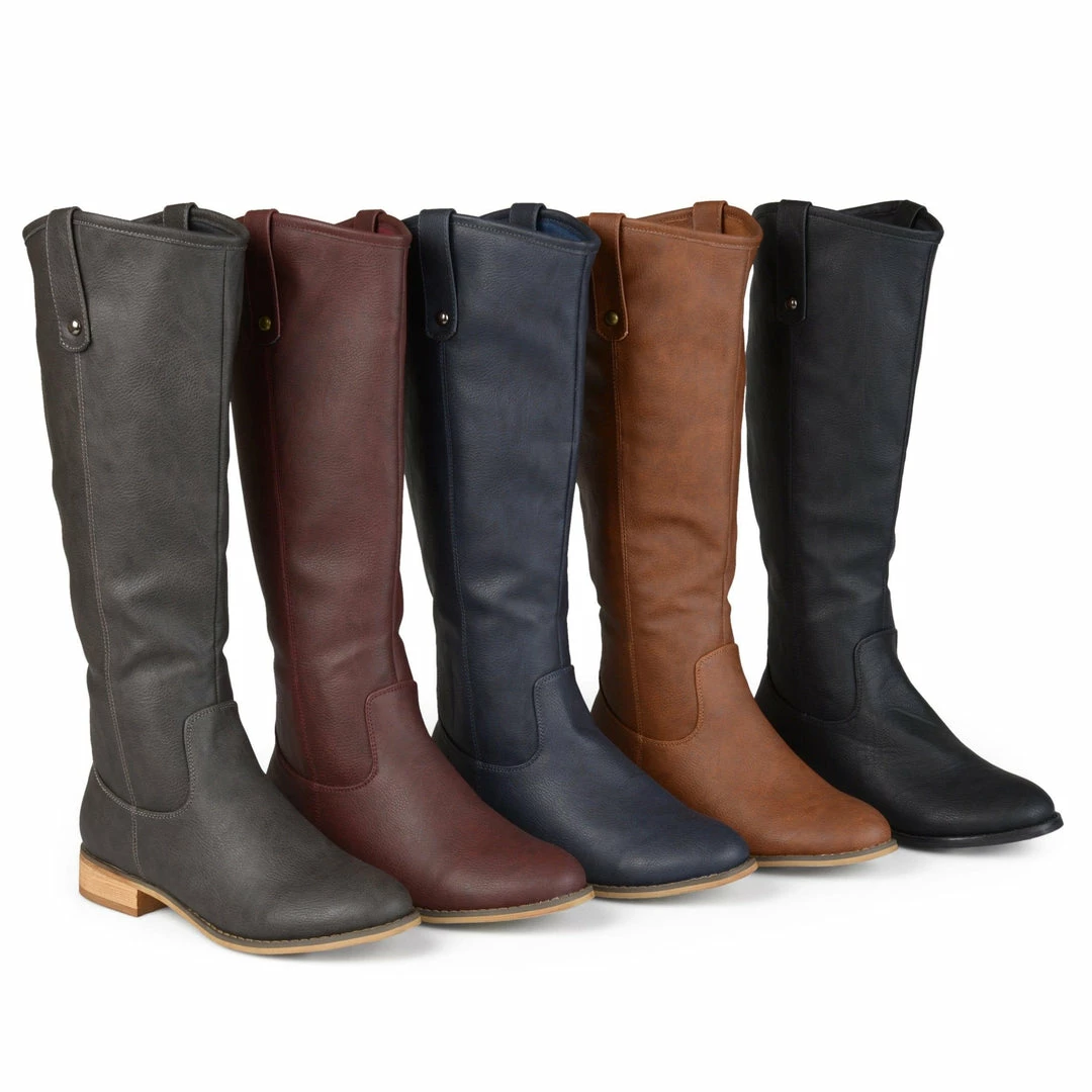 This understated knee-high boot features classic riding details such as a pull-on loop design and round studs. A barely-there block heel, flexible vegan leather, and inside zipper complete this cold-weather staple.