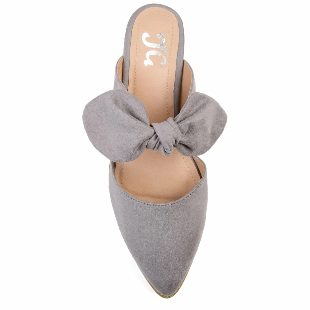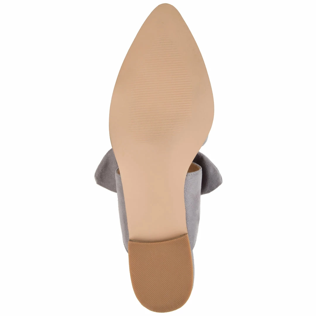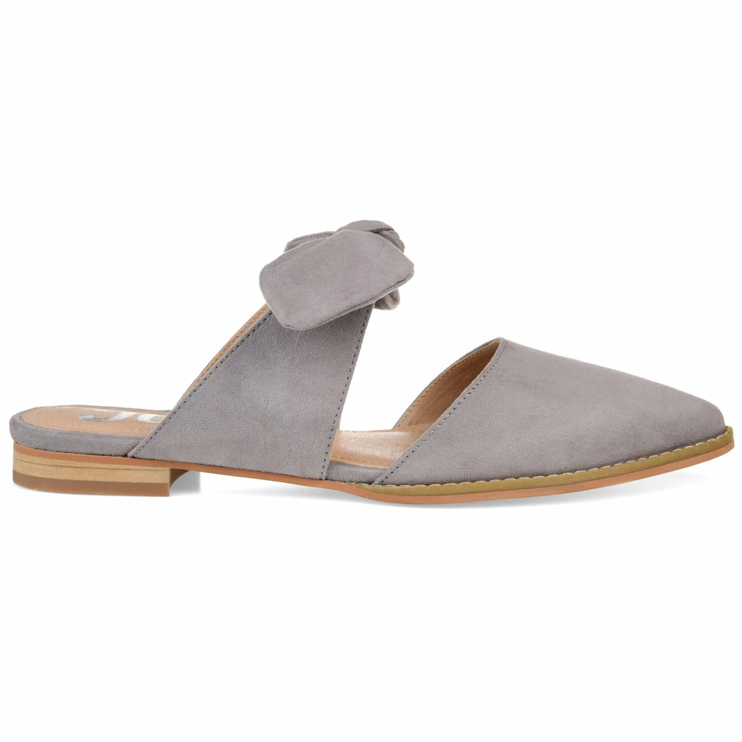 A pointed-toe slip-on flat made with velvety soft microsuede uppers resting on a tiny heel. This sophisticated mule is finished with a thick strap at the vamp tied into an oversized bow and topstitch details.