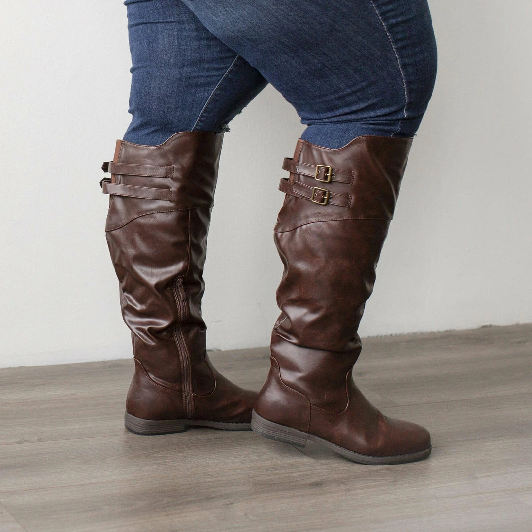 Buckle accents rest atop the shaft of this extra-wide calf vegan leather riding boot for a traditional look.