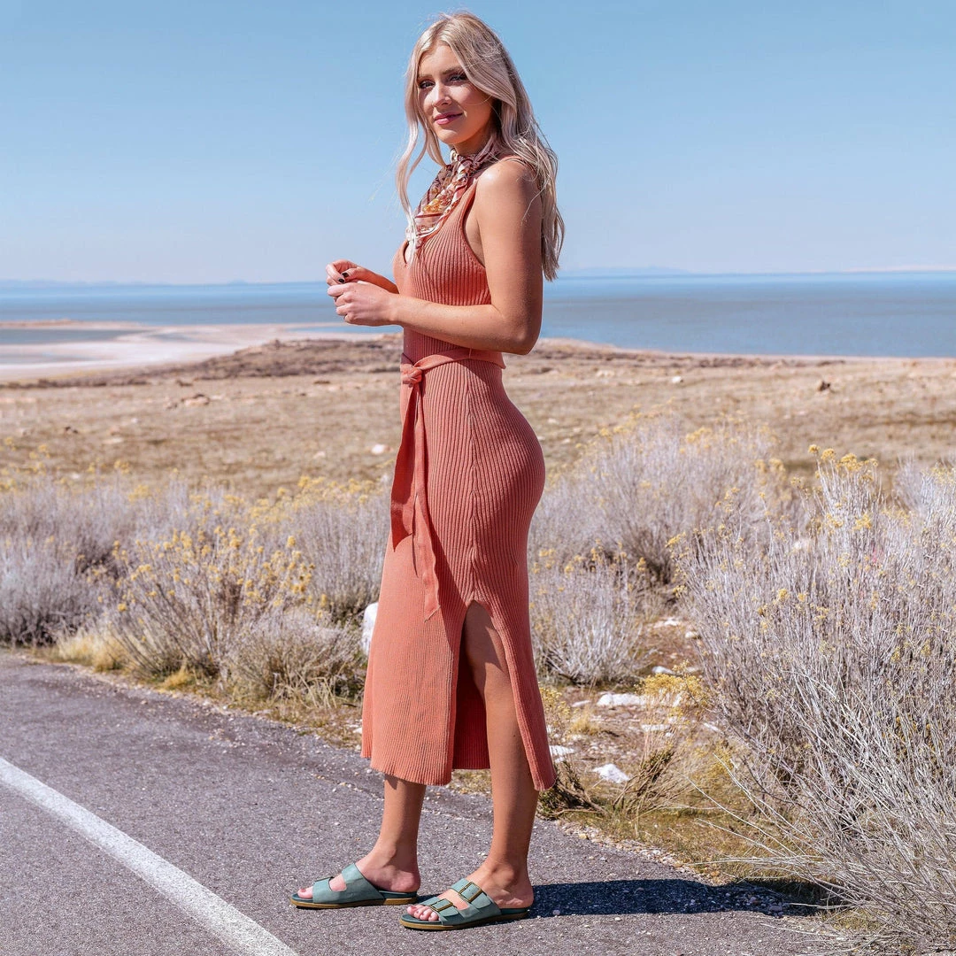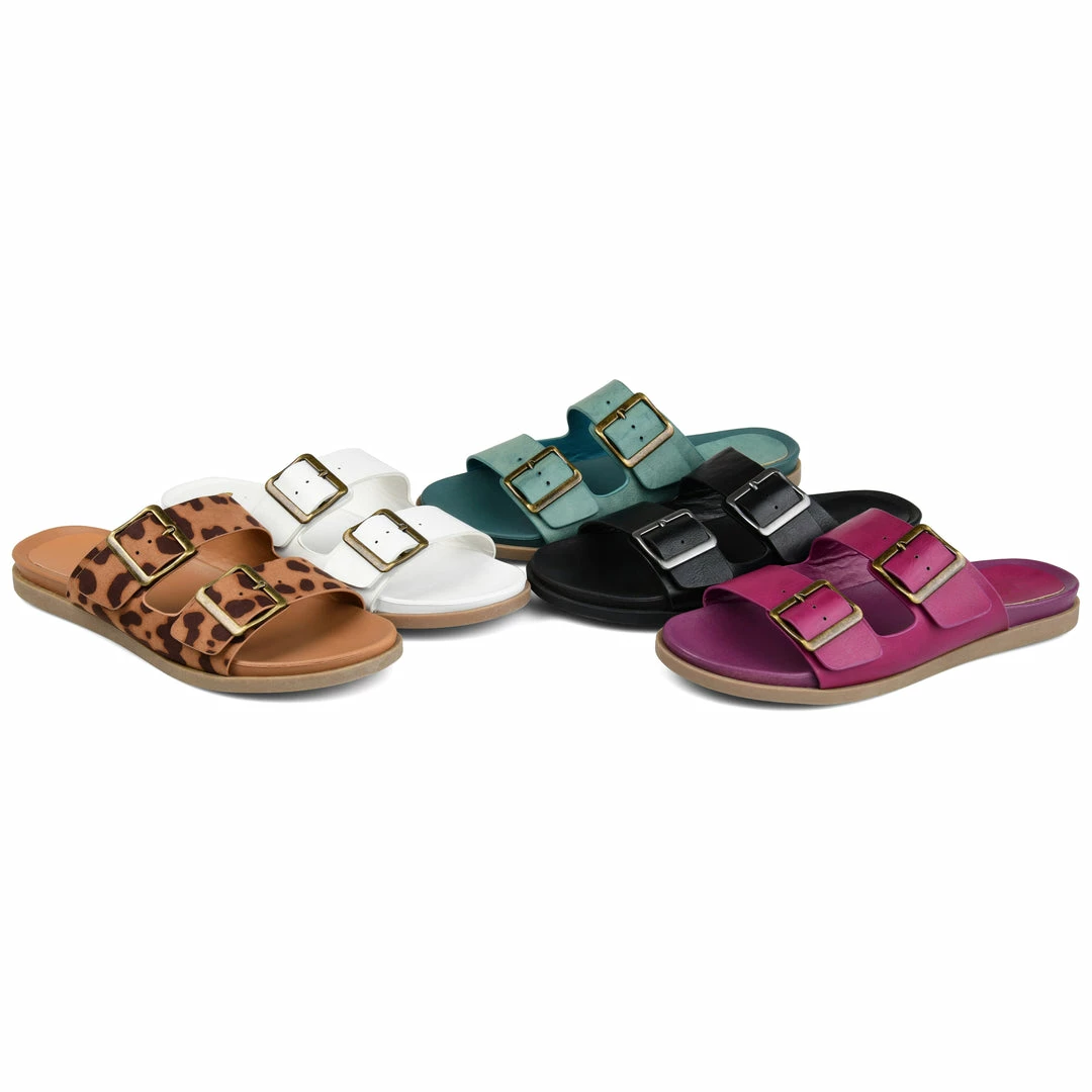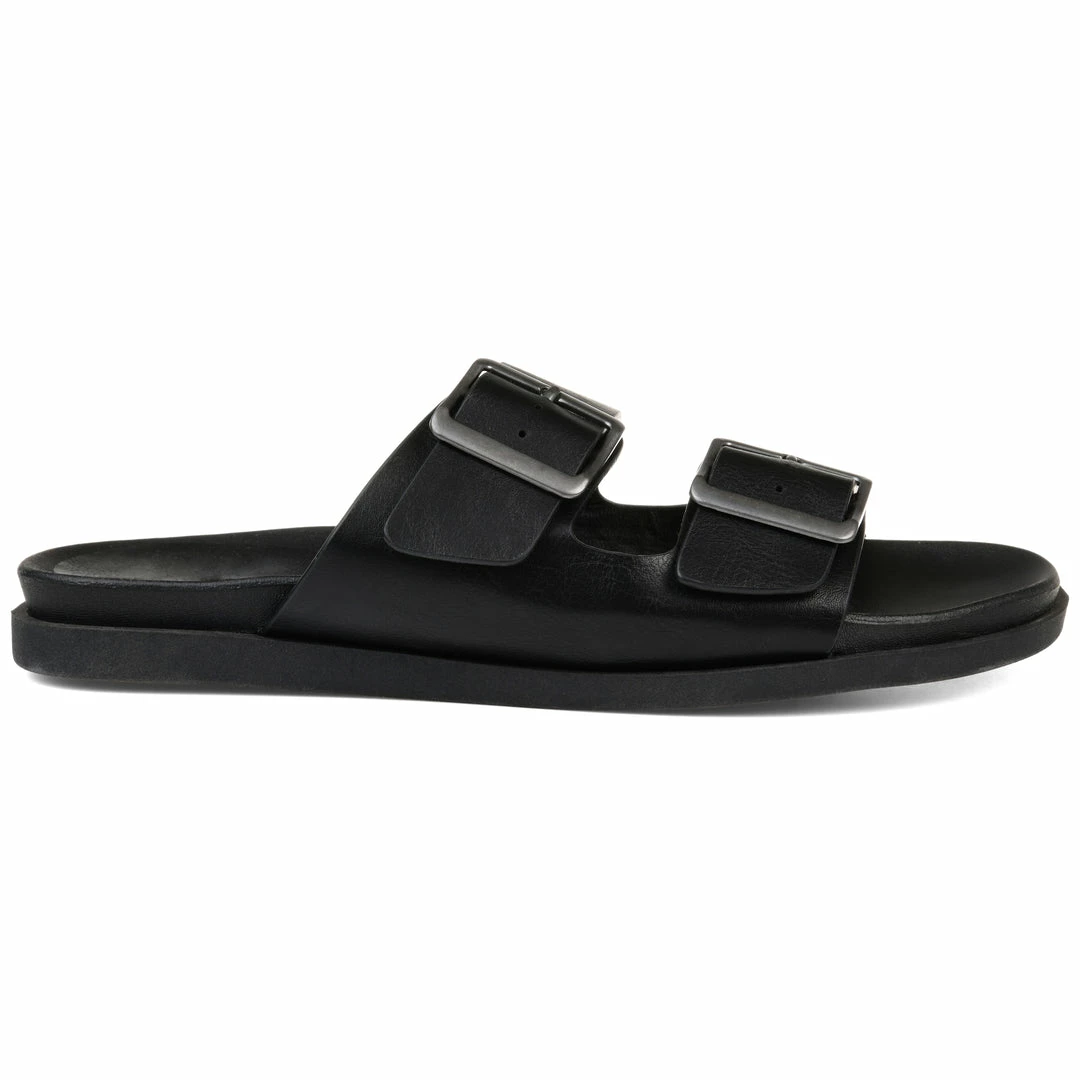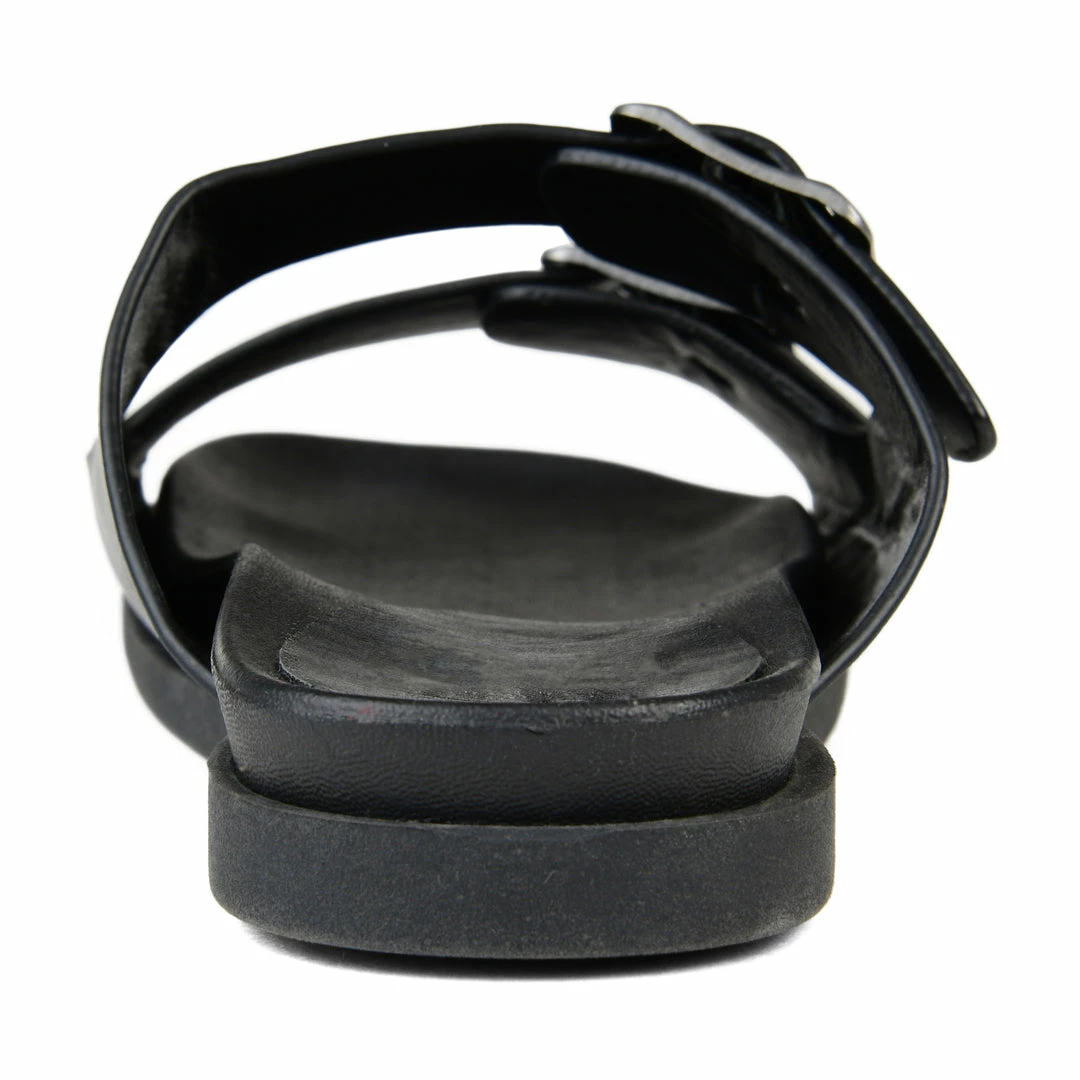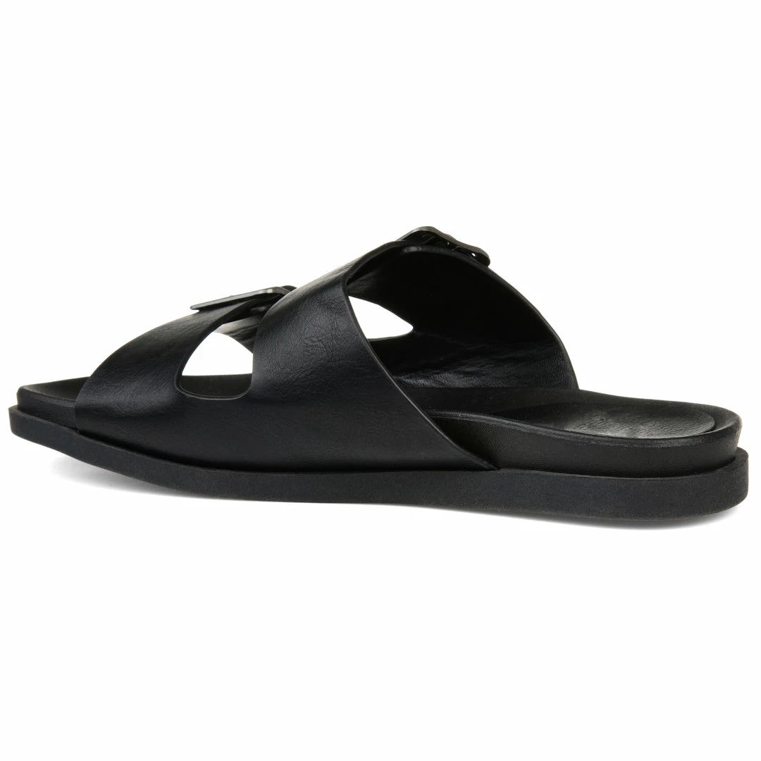 Bold square buckles top this throwback style. This cool, comfy, chunky slide is made with vegan leather uppers shaped into a thick dual toe strap resting on a flexible yet durable rubber sole for a perfectly effortless look.