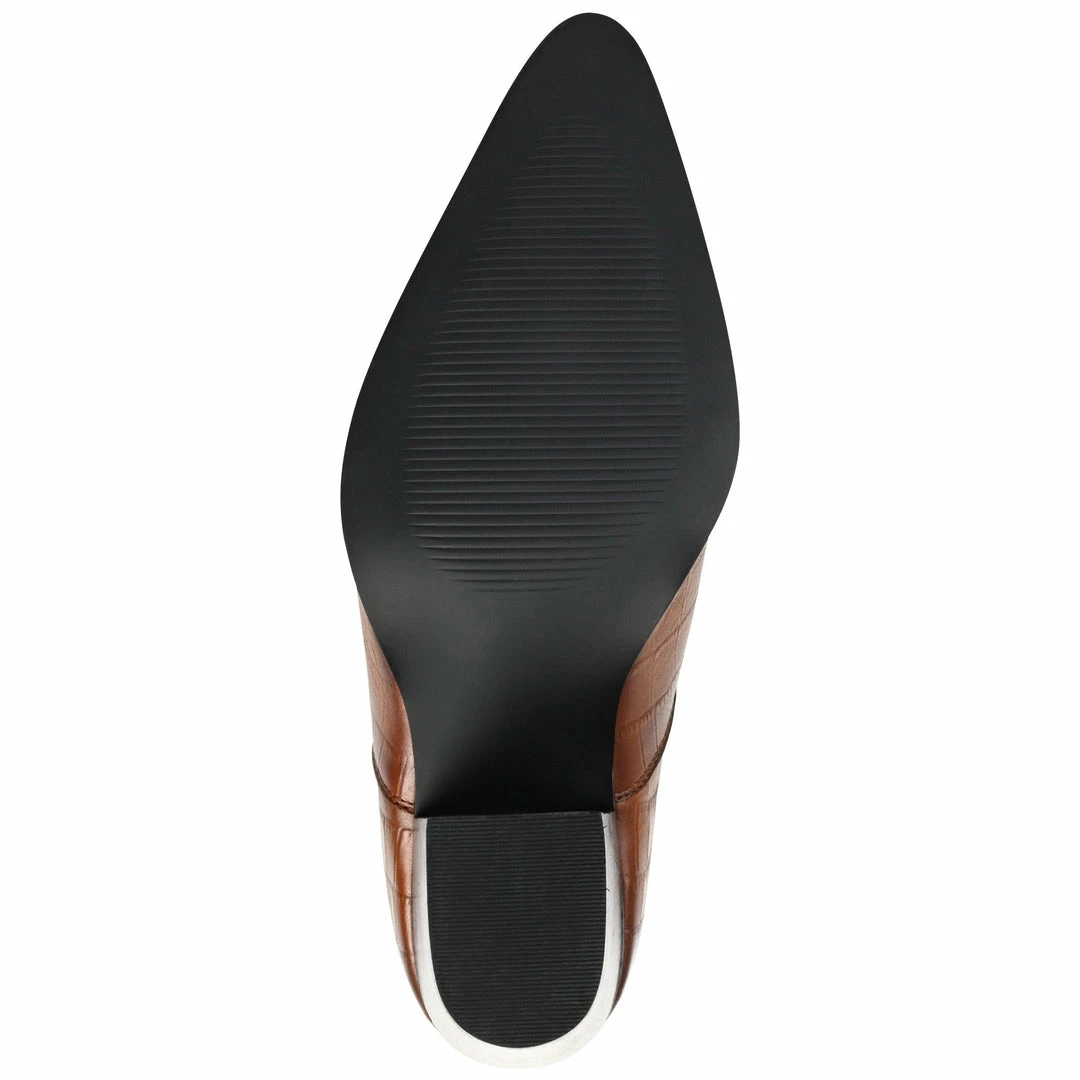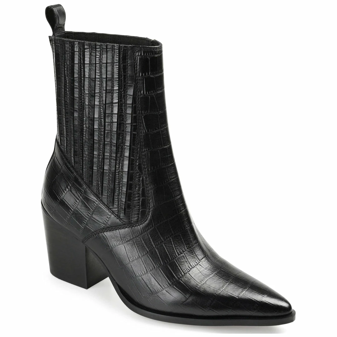 These genuine leather booties with croc texture throughout and covered stretch gore always have a point to make.